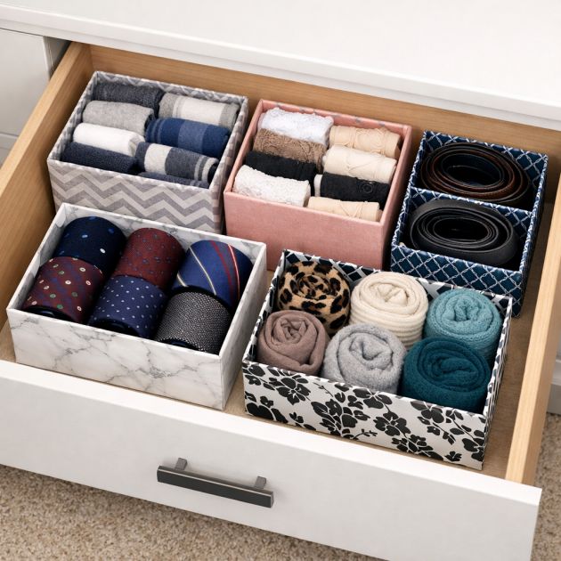 Arrange these boxes inside your drawers to separate socks, underwear, scarves, or ties. For a more customized fit, measure the height of your drawer and cut the boxes accordingly. This method not only helps keep your belongings tidy but also makes it easy to locate items at a glance.
