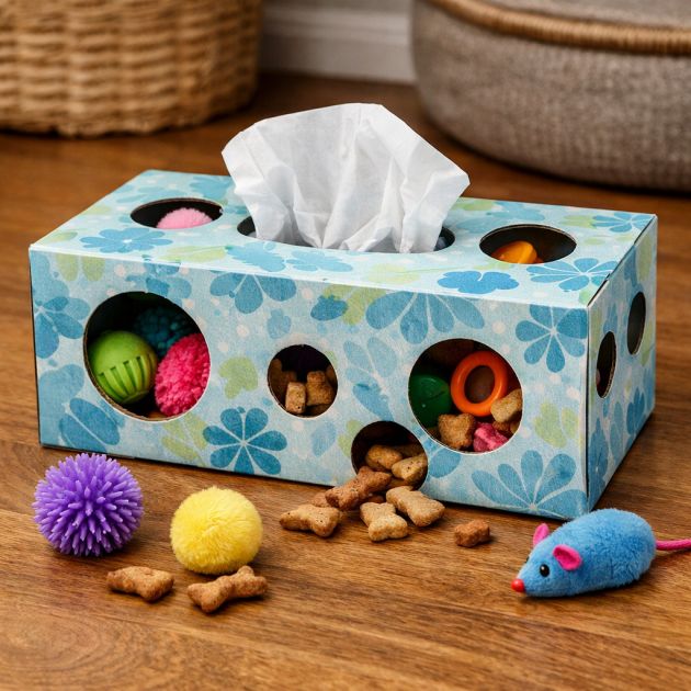 Pets love toys and treats, and a tissue box can become a fun dispensing station for both. Place small toys or treats inside the box, encouraging your pet to 'hunt' for them.