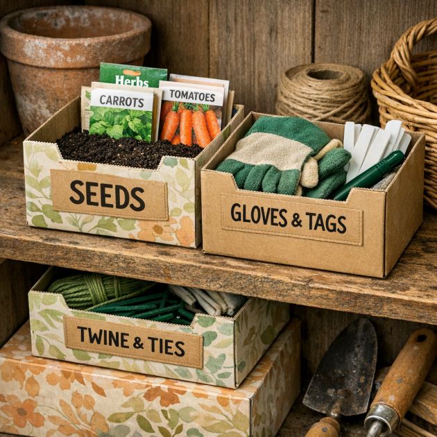 Alternatively, use tissue boxes to store small garden supplies such as gloves, seed packets, and tags. Label the boxes for easy identification and stack them in your gardening shed or storage area.