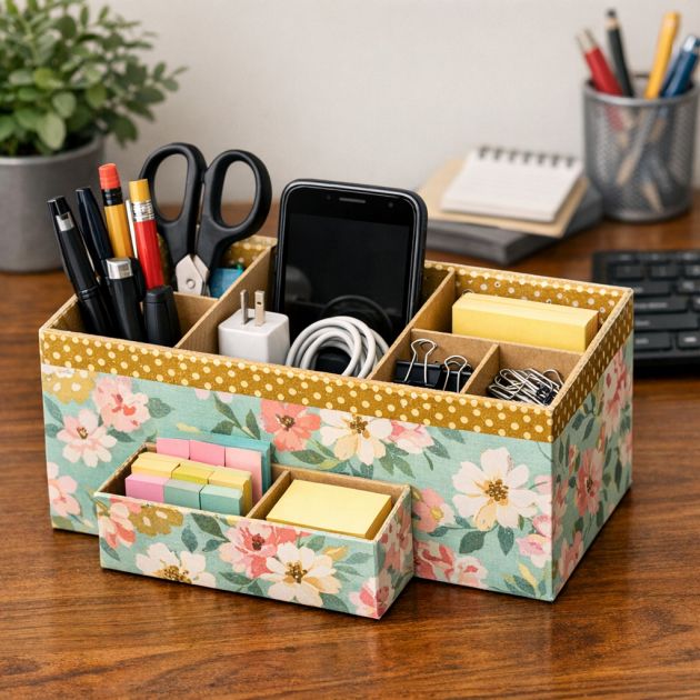 Decorate the outside with washi tape, wrapping paper, or paint to match your office decor. Use these compartments to store pens, phone chargers, sticky notes, and other desk essentials. This simple project turns clutter into an organized and visually appealing setup.
