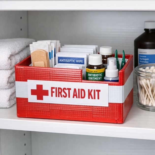 A well-organized first-aid kit is essential in every home. Convert a tissue box into a first-aid caddy by covering it with waterproof contact paper or duct tape for durability.