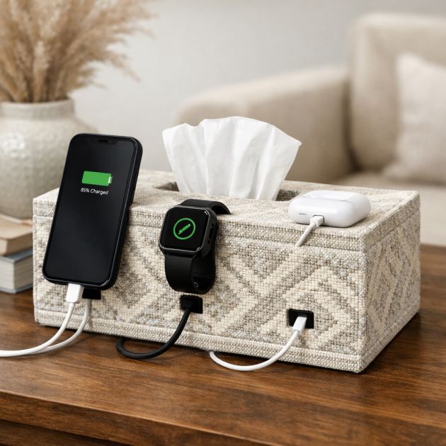 With multiple devices in our homes, charging stations can become cluttered. Use a tissue box to create a discreet charging station by cutting holes on the sides or back for cables.